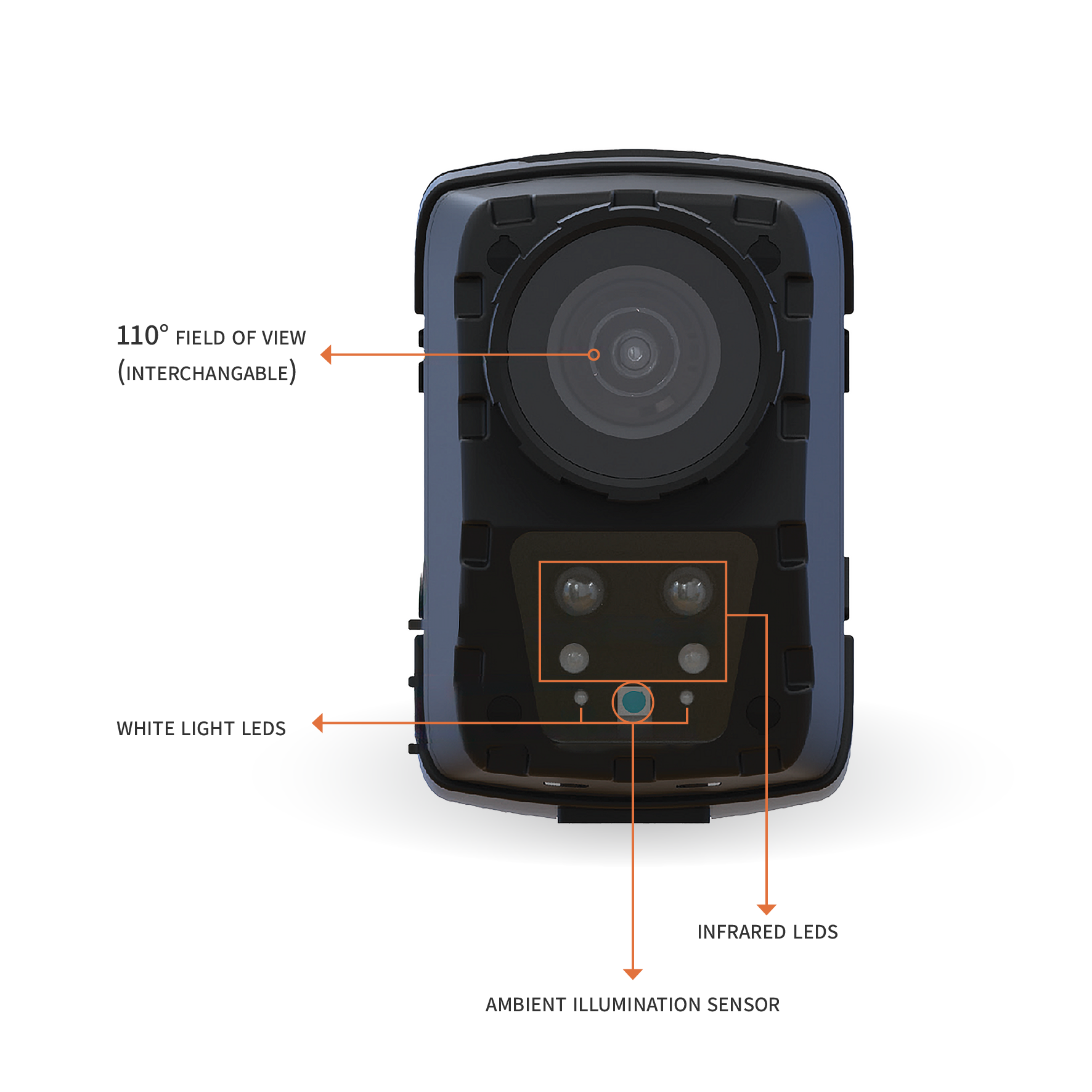 4G Streaming*, GPS location, WIFI Connectivity, Covert Mode, Power Save Mode, Date| Time| Camera and User ID Stamp, Loop Recording, Voice Indications, Vibration Location, LED Indication, Optional Lens Replacement.